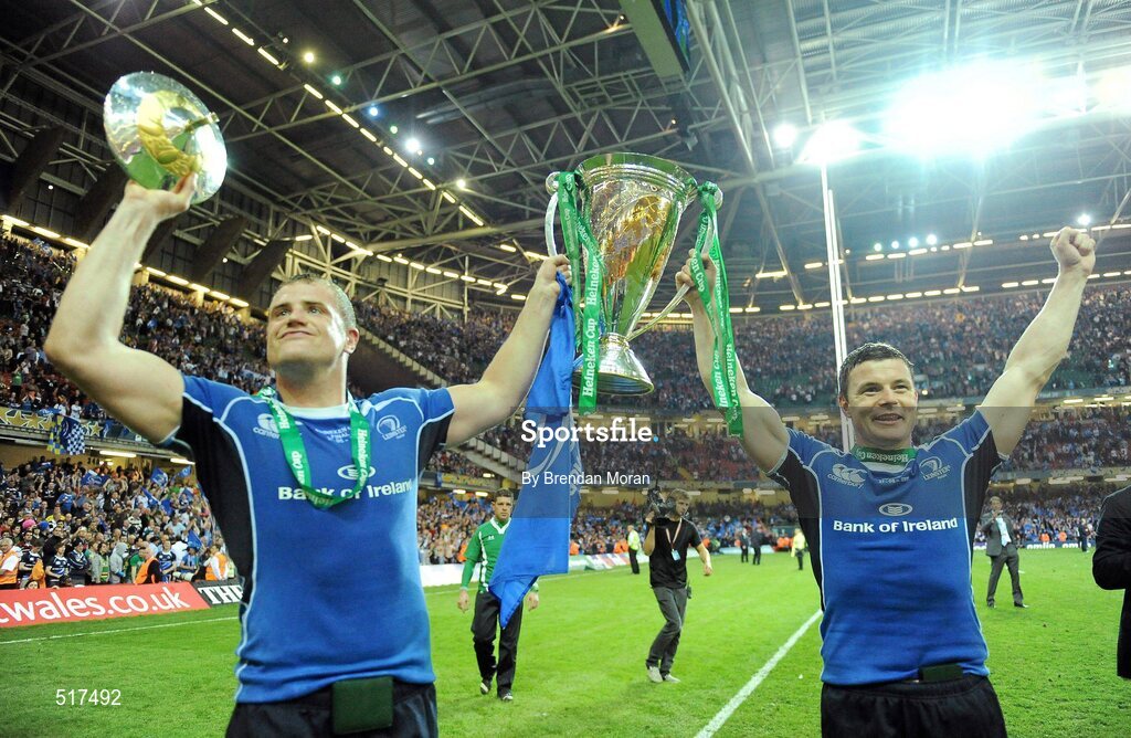 21 May 2011; Leinster's Jamie Heaslip, left, and Brian O'Driscoll celebrate with the Heineken Cup after the game. Heineken Cup Final, Leinster v Northampton Saints, Millennium Stadium, Cardiff, Wales. Picture credit: Brendan Moran / SPORTSFILE