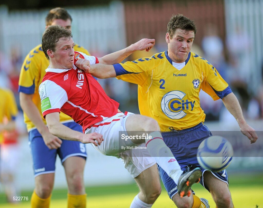 3 June 2011; David McMillain, St Patrick's Athletic, in action against Derek Griffin, Crumlin United. FAI Ford Cup Third Round, Crumlin United v St Patrick's Athletic, Richmond Park, Inchicore, Dublin. Picture credit: Matt Browne / SPORTSFILE