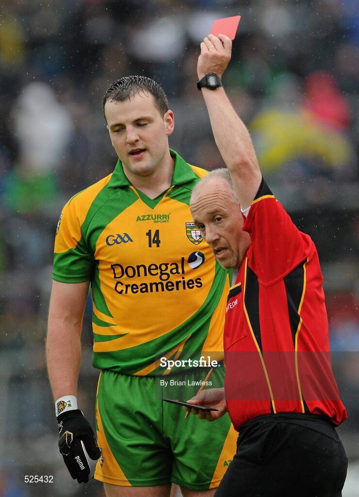 12 June 2011; Donegal's Michael Murphy reacts as he is shown the red card by referee Marty Duffy. Ulster GAA Football Senior Championship Quarter-Final, Cavan v Donegal, Kingspan Breffni Park, Co. Cavan. Picture credit: Brian Lawless / SPORTSFILE