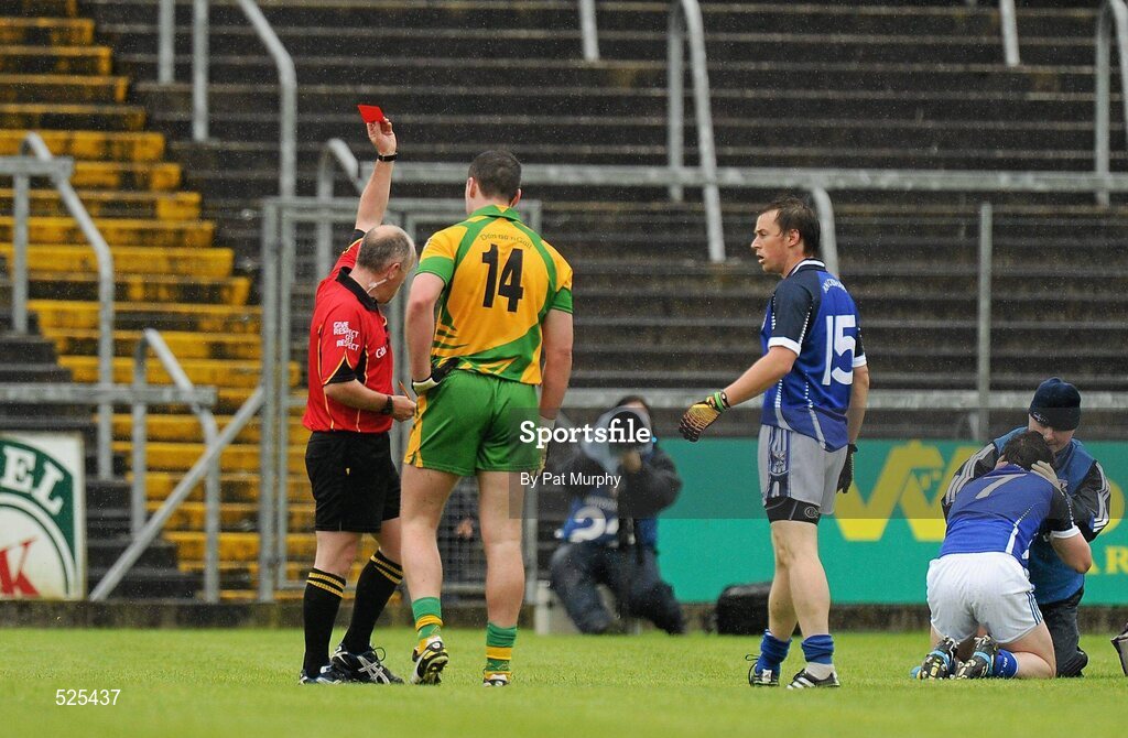 12 June 2011; Michael Murphy, Donegal, 14, is shown the red card by referee Marty Duffy. Ulster GAA Football Senior Championship Quarter-Final, Cavan v Donegal, Kingspan Breffni Park, Co. Cavan. Picture credit: Pat Murphy / SPORTSFILE