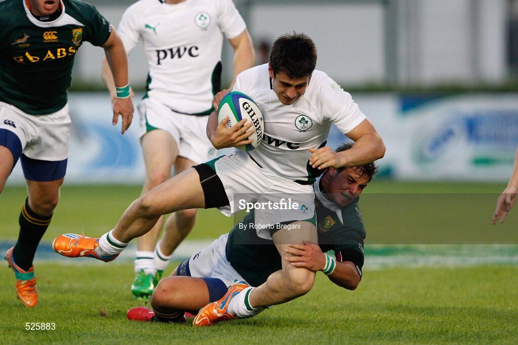 14 June 2011; Tiernan O'Halloran, Ireland, is stopped by the South Africa defense. IRB Junior World Championship, Pool C, Ireland v South Africa, Stadio Communale di Monigo, Treviso, Italy. Picture credit: Roberto Bregani / SPORTSFILE