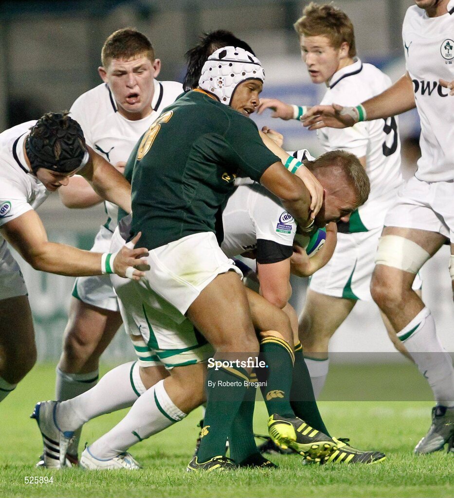 14 June 2011; Jordi Murphy, Ireland, is tackled by Nizaam Carr, South Africa. IRB Junior World Championship, Pool C, Ireland v South Africa, Stadio Communale di Monigo, Treviso, Italy. Picture credit: Roberto Bregani / SPORTSFILE