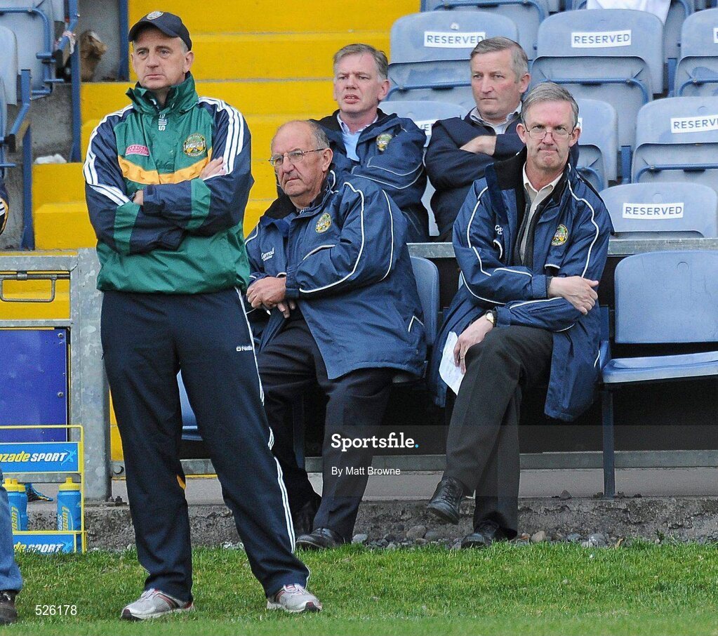 15 June 2011; Offaly county board chairman Pat Teehan, right, and county board secretary Tony Murphy watch Offaly in action against Carlow with team manager Joe Dooley, left. Walsh Cup Shield Final, Carlow v Offaly, O'Moore Park, Portlaoise, Co. Laois. Picture credit: Matt Browne / SPORTSFILE