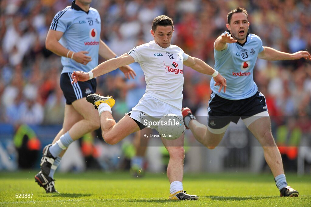 26 June 2011; Eamonn Callaghan, Kildare, beats Declan Lally, Dublin to score his side's first goal. Leinster GAA Football Senior Championship Semi-Final, Dublin v Kildare, Croke Park, Dublin. Picture credit: David Maher / SPORTSFILE