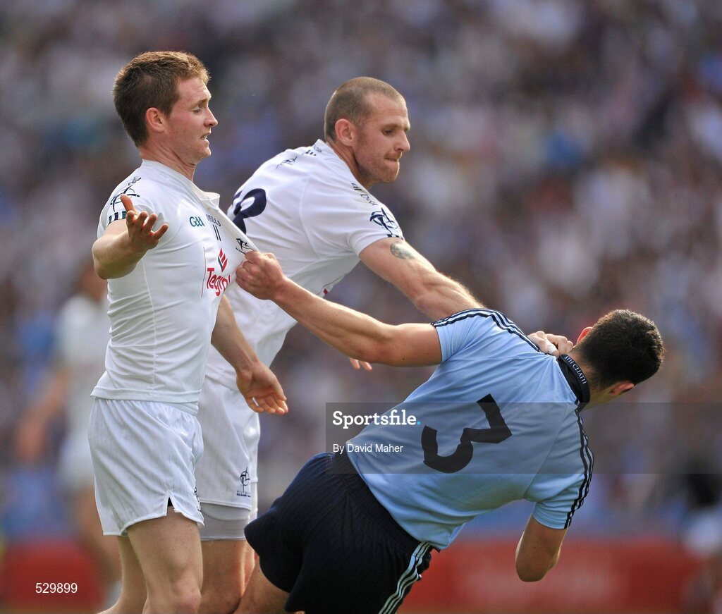 26 June 2011; Kildare's Eoghan O'Flaherty, left, and Ronan Sweeney clash with Rory O'Carroll, Dublin, resulting with Ronan Sweeney, receiving a yellow card from referee Cormac Reilly. Leinster GAA Football Senior Championship Semi-Final, Dublin v Kildare, Croke Park, Dublin. Picture credit: David Maher / SPORTSFILE