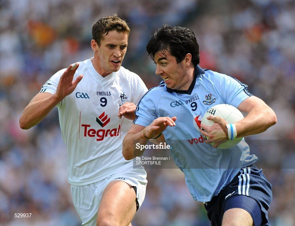 26 June 2011; Michael Daragh McAuley, Dublin, in action against Hugh Lynch, Kildare. Leinster GAA Football Senior Championship Semi-Final, Dublin v Kildare, Croke Park, Dublin. Picture credit: Dáire Brennan / SPORTSFILE