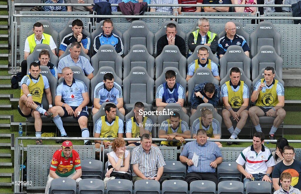 26 June 2011; Eoghan O'Gara, 14, Dublin, sits in his teams dug out after being shown a red card by referee Cormac Reilly. Leinster GAA Football Senior Championship Semi-Final, Dublin v Kildare, Croke Park, Dublin. Picture credit: Brendan Moran / SPORTSFILE