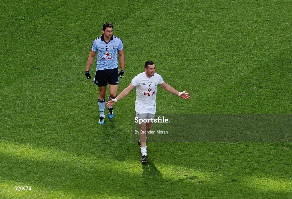 26 June 2011; Aindriu MacLochlain, Kildare, appeals to referee after a free was awarded against him in added time, which led to the winning point for Dublin, scored by Bernard Brogan. Leinster GAA Football Senior Championship Semi-Final, Dublin v Kildare, Croke Park, Dublin. Picture credit: Brendan Moran / SPORTSFILE