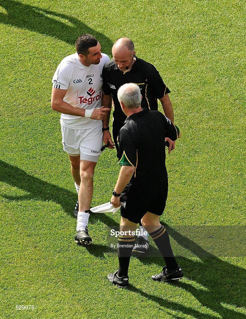 26 June 2011; Aindriu MacLochlain, Kildare, speaks to referee Cormac Reilly at the end of the game. Leinster GAA Football Senior Championship Semi-Final, Dublin v Kildare, Croke Park, Dublin. Picture credit: Brendan Moran / SPORTSFILE