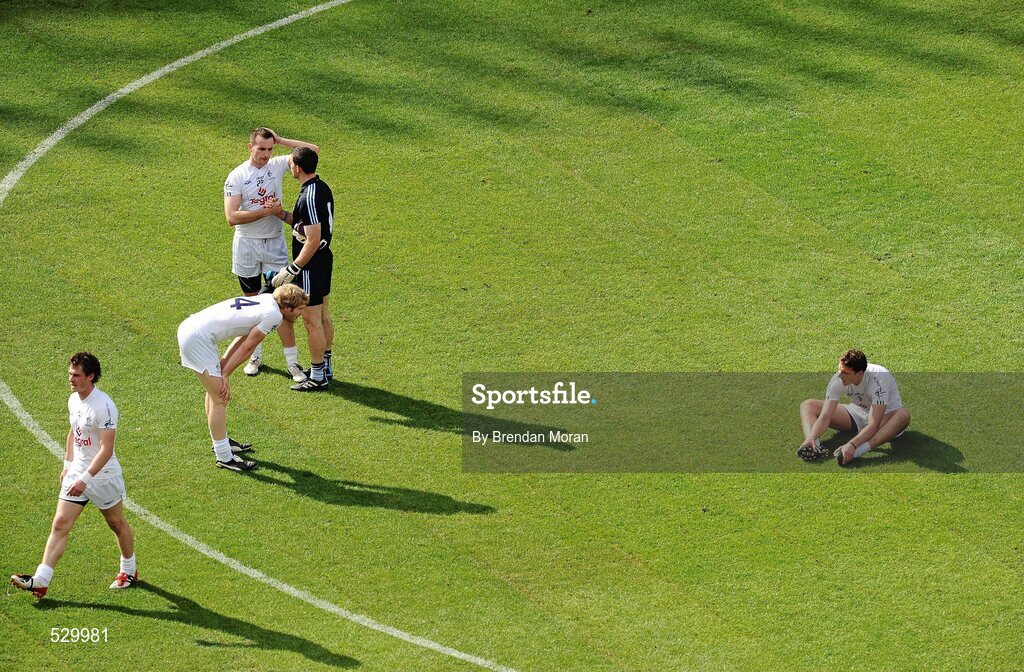 26 June 2011; Dublin goalkeeper Stephen Cluxton shakes hands with Kildare's Robert Kelly, as dejected Kildare players, from left, Emmet Bolton, Tomas O'Connor and Hugh Lynch look on. Leinster GAA Football Senior Championship Semi-Final, Dublin v Kildare, Croke Park, Dublin. Picture credit: Brendan Moran / SPORTSFILE