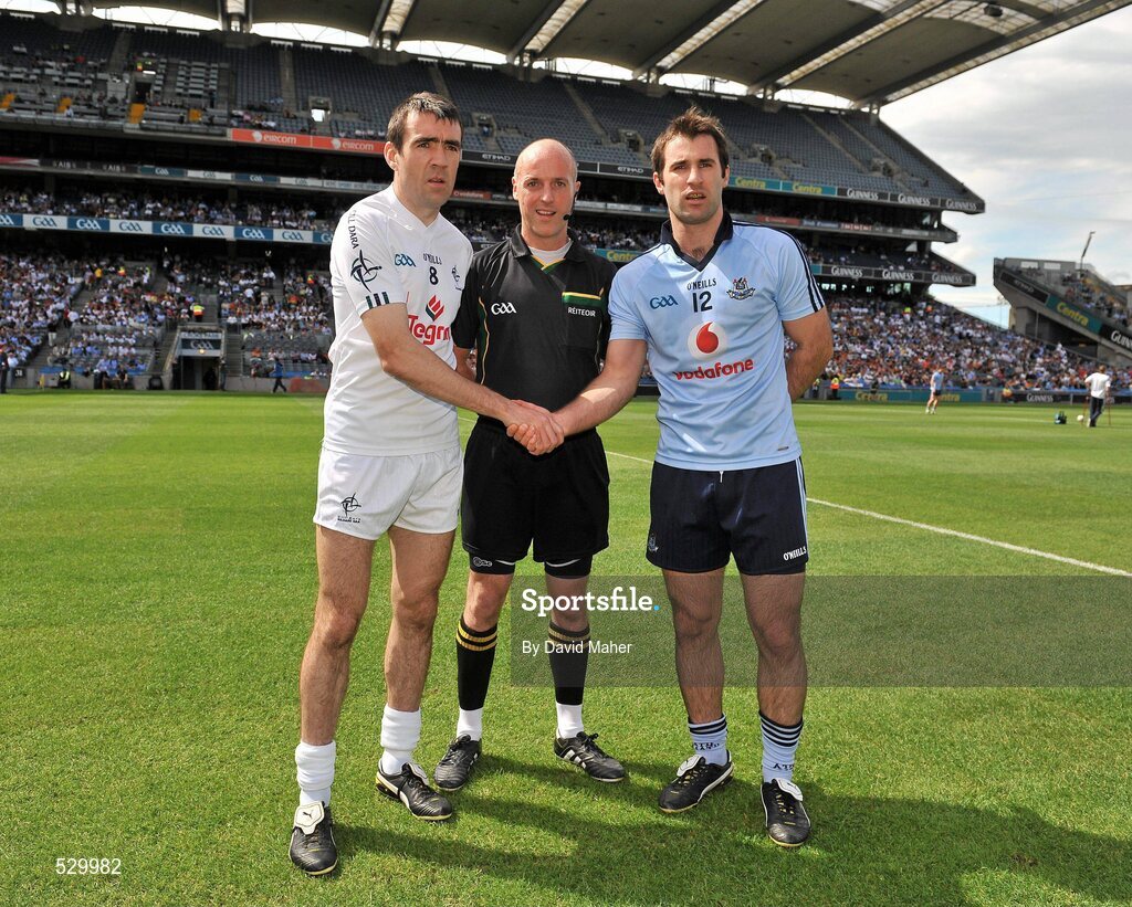 26 June 2011; Referee Cormac Reilly with captains John Doyle, left, Kildare, and Bryan Cullen, Dublin. Leinster GAA Football Senior Championship Semi-Final, Dublin v Kildare, Croke Park, Dublin. Picture credit: David Maher / SPORTSFILE