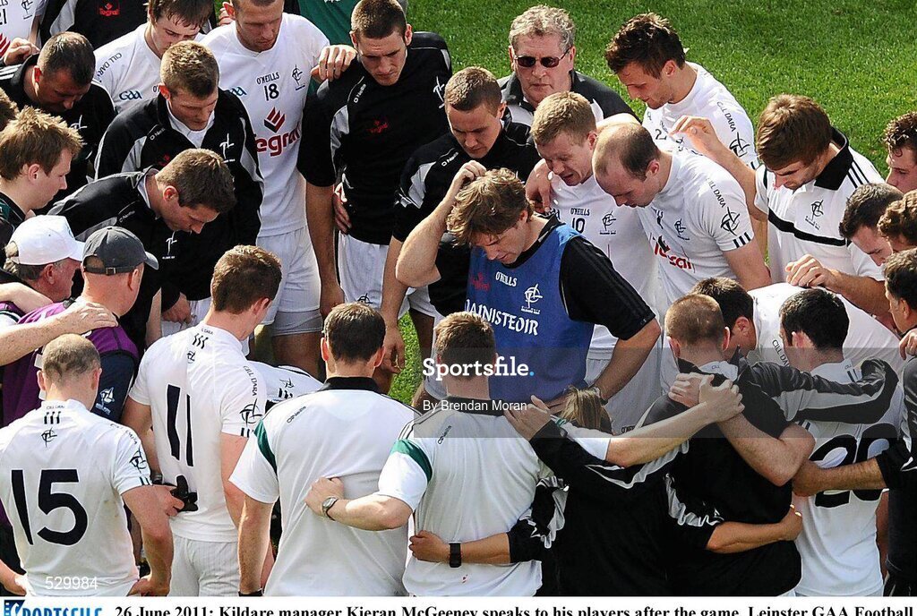 26 June 2011; Kildare manager Kieran McGeeney speaks to his players after the game. Leinster GAA Football Senior Championship Semi-Final, Dublin v Kildare, Croke Park, Dublin. Picture credit: Brendan Moran / SPORTSFILE