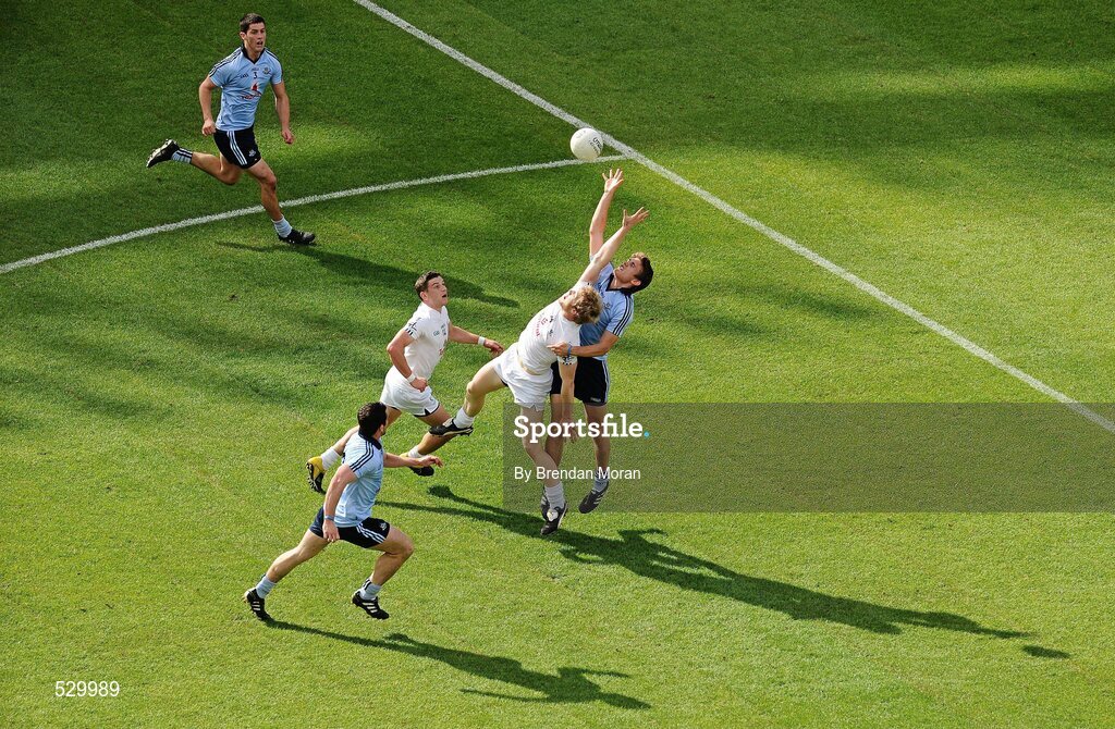 26 June 2011; Michael Fitzsimons, 4, Dublin, contests a dropping ball with Tomas O'Connor, Kildare. Leinster GAA Football Senior Championship Semi-Final, Dublin v Kildare, Croke Park, Dublin. Picture credit: Brendan Moran / SPORTSFILE