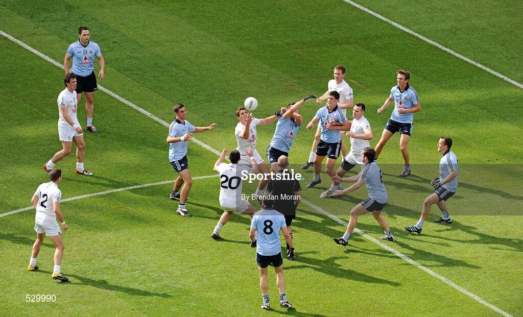 26 June 2011; A ball thrown in by referee Cormac Reilly is contested by Hugh Lynch and Padraig O'Neill, Kildare, and Éamon Fennell and James McCarthy, 5, Dublin. Leinster GAA Football Senior Championship Semi-Final, Dublin v Kildare, Croke Park, Dublin. Picture credit: Brendan Moran / SPORTSFILE