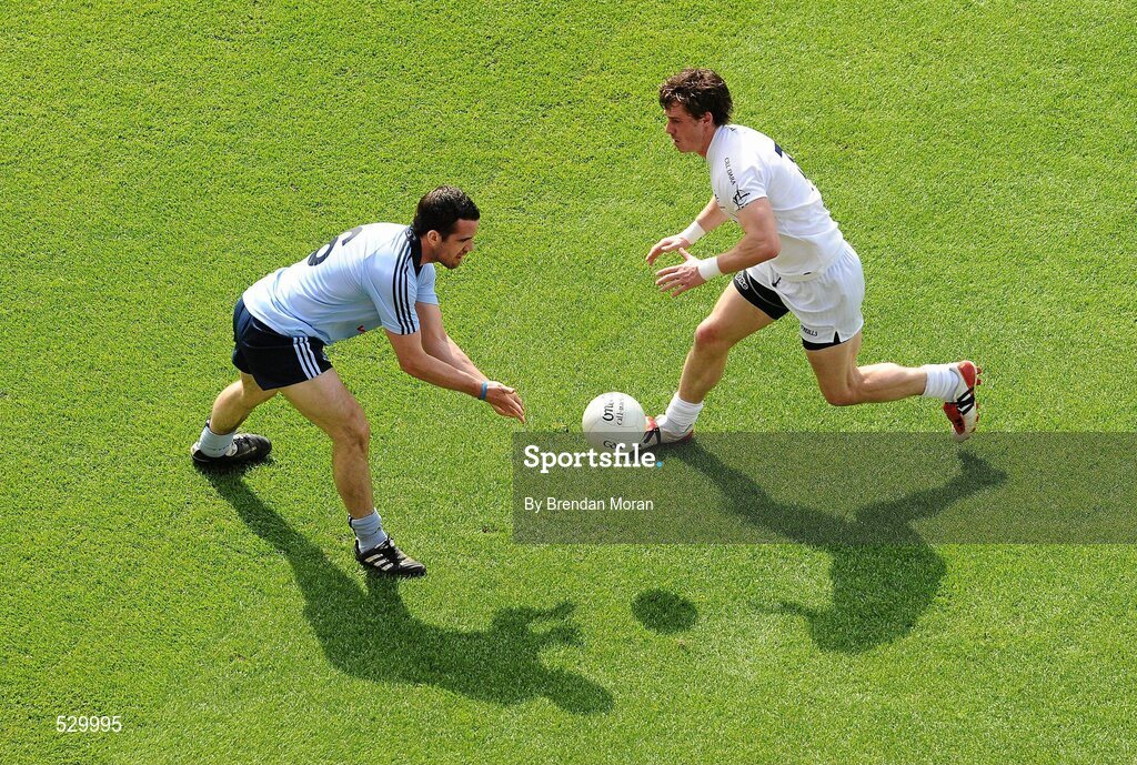 26 June 2011; Ger Brennan, Dublin, handpasses the ball past Emmet Bolton, Kildare. Leinster GAA Football Senior Championship Semi-Final, Dublin v Kildare, Croke Park, Dublin. Picture credit: Brendan Moran / SPORTSFILE