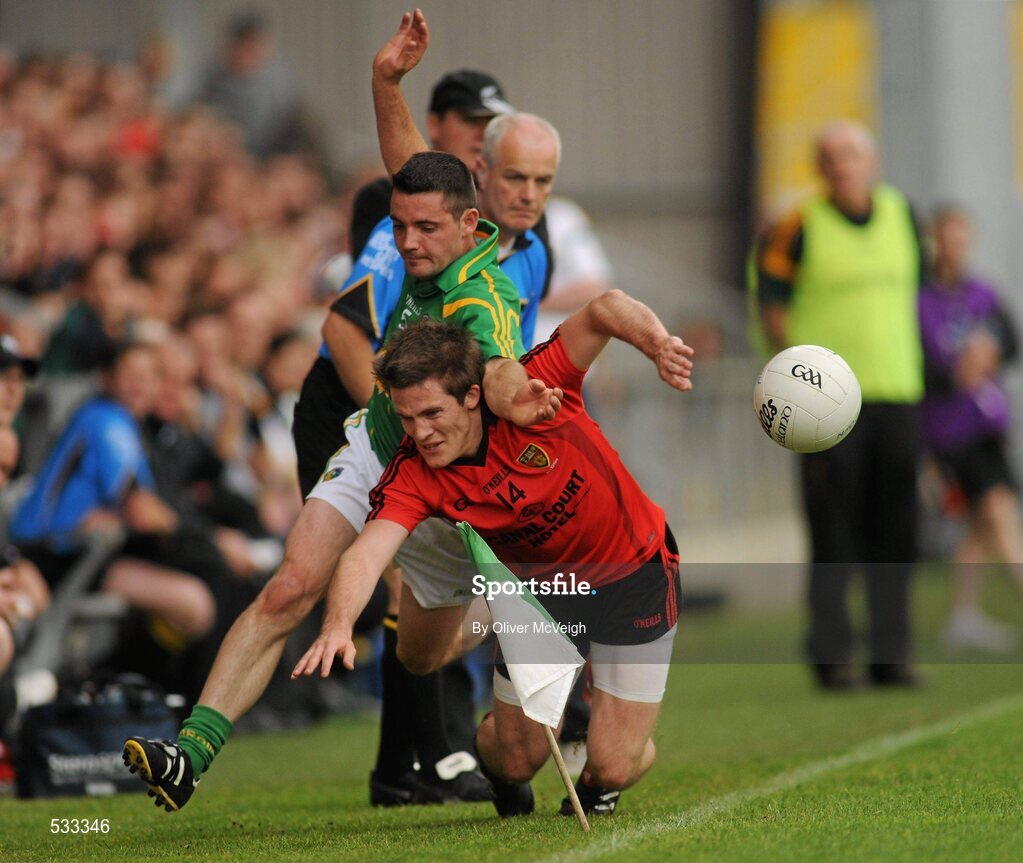 9 July 2011; Paul McComiskey, Down, in action against Daniel Beck, Leitrim. GAA Football All-Ireland Senior Championship Qualifier Round 2, Down v Leitrim, Pairc Esler, Newry, Co. Down. Picture credit: Oliver McVeigh / SPORTSFILE