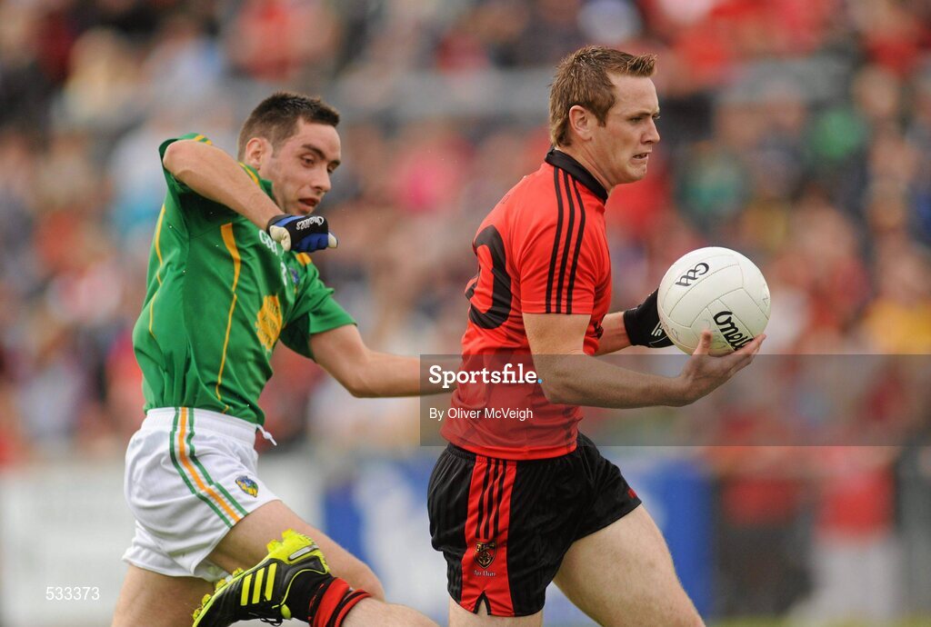 9 July 2011; Peter Fitzpatrick, Down, in action against John McKeon, Leitrim. GAA Football All-Ireland Senior Championship Qualifier Round 2, Down v Leitrim, Pairc Esler, Newry, Co. Down. Picture credit: Oliver McVeigh / SPORTSFILE