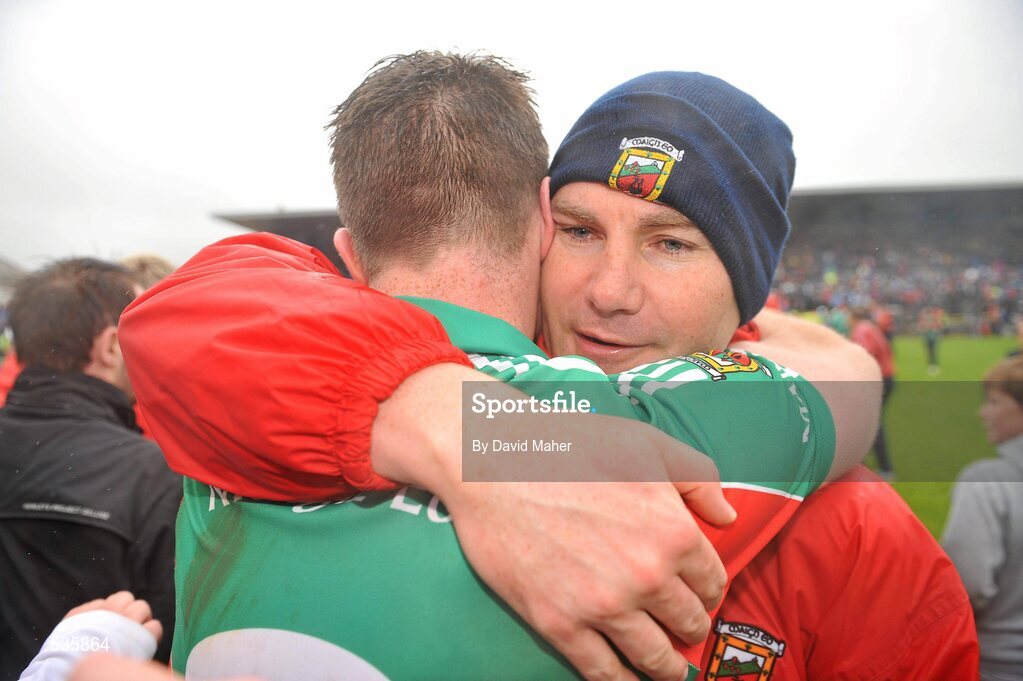 17 July 2011; James Horan, Mayo manager, celebrates at the end of the game with Seamus O'Shea. Connacht GAA Football Senior Championship Final, Roscommon v Mayo, Dr. Hyde Park, Roscommon. Picture credit: David Maher / SPORTSFILE