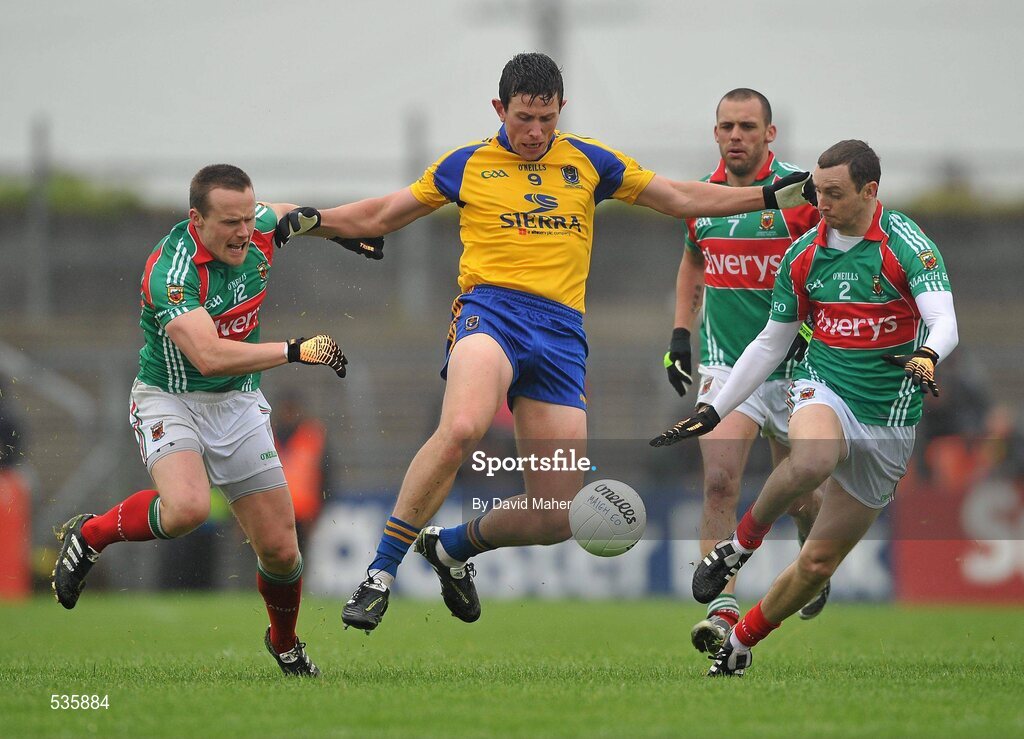 17 July 2011; Karol Mannion, Roscommon, in action against Andy Moran, left, and Keith Higgins, Mayo. Connacht GAA Football Senior Championship Final, Roscommon v Mayo, Dr. Hyde Park, Roscommon. Picture credit: David Maher / SPORTSFILE