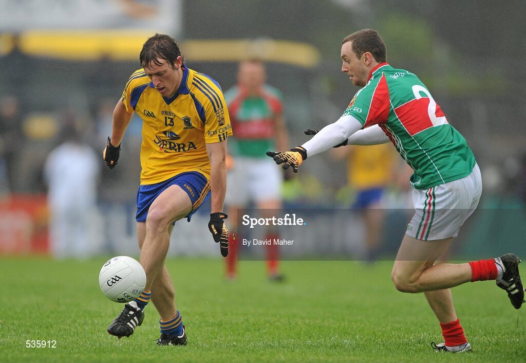 17 July 2011; Conor Devaney, Roscommon, in action against Keith Higgins, Mayo. Connacht GAA Football Senior Championship Final, Roscommon v Mayo, Dr. Hyde Park, Roscommon. Picture credit: David Maher / SPORTSFILE