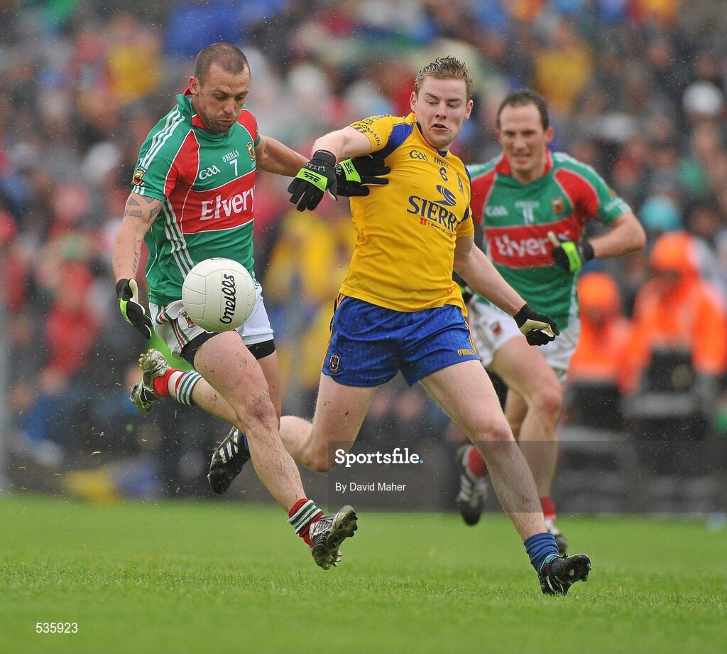 17 July 2011; Trevor Mortimer, Mayo, in action against Peter Domican, Roscommon. Connacht GAA Football Senior Championship Final, Roscommon v Mayo, Dr. Hyde Park, Roscommon. Picture credit: David Maher / SPORTSFILE