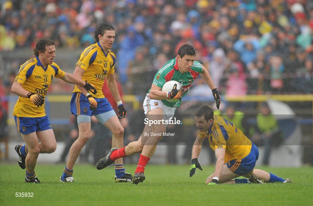 17 July 2011; Alan Freeman, Mayo, in action against Roscommon players left to right, Conor Devaney, Senan O'Grady and Niall Carty. Connacht GAA Football Senior Championship Final, Roscommon v Mayo, Dr. Hyde Park, Roscommon. Picture credit: David Maher / SPORTSFILE