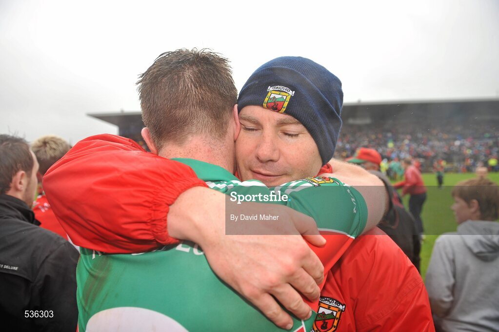 17 July 2011; Mayo manager James Horan celebrates at the end of the game with Seamus O'Shea. Connacht GAA Football Senior Championship Final, Roscommon v Mayo, Dr. Hyde Park, Roscommon. Picture credit: David Maher / SPORTSFILE