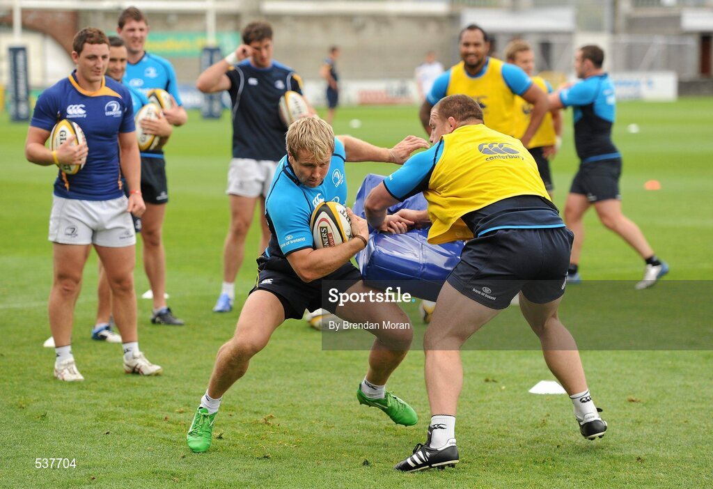 22 July 2011; New Leinster signing Fionn Carr is tackled by Heinke van der Merwe during an open training session ahead of the 2011/12 season. Tallaght Stadium, Tallaght, Dublin. Picture credit: Brendan Moran / SPORTSFILE