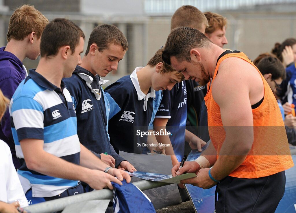 22 July 2011; Leinster's Cian Healy signs an autograph during an open training session ahead of the 2011/12 season. Tallaght Stadium, Tallaght, Dublin. Picture credit: Brendan Moran / SPORTSFILE