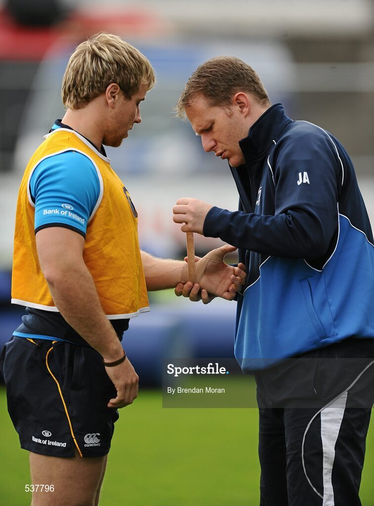 22 July 2011; Leinster's Fionn Carr has his wrists strapped by physio James Allen during an open training session ahead of the 2011/12 season. Tallaght Stadium, Tallaght, Dublin. Picture credit: Brendan Moran / SPORTSFILE