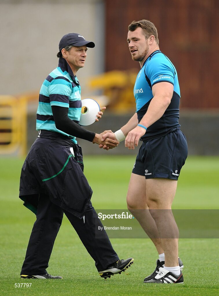 22 July 2011; Leinster's Cian Healy shakes hands with Ireland defence coach Les Kiss during an open training session ahead of the 2011/12 season. Tallaght Stadium, Tallaght, Dublin. Picture credit: Brendan Moran / SPORTSFILE