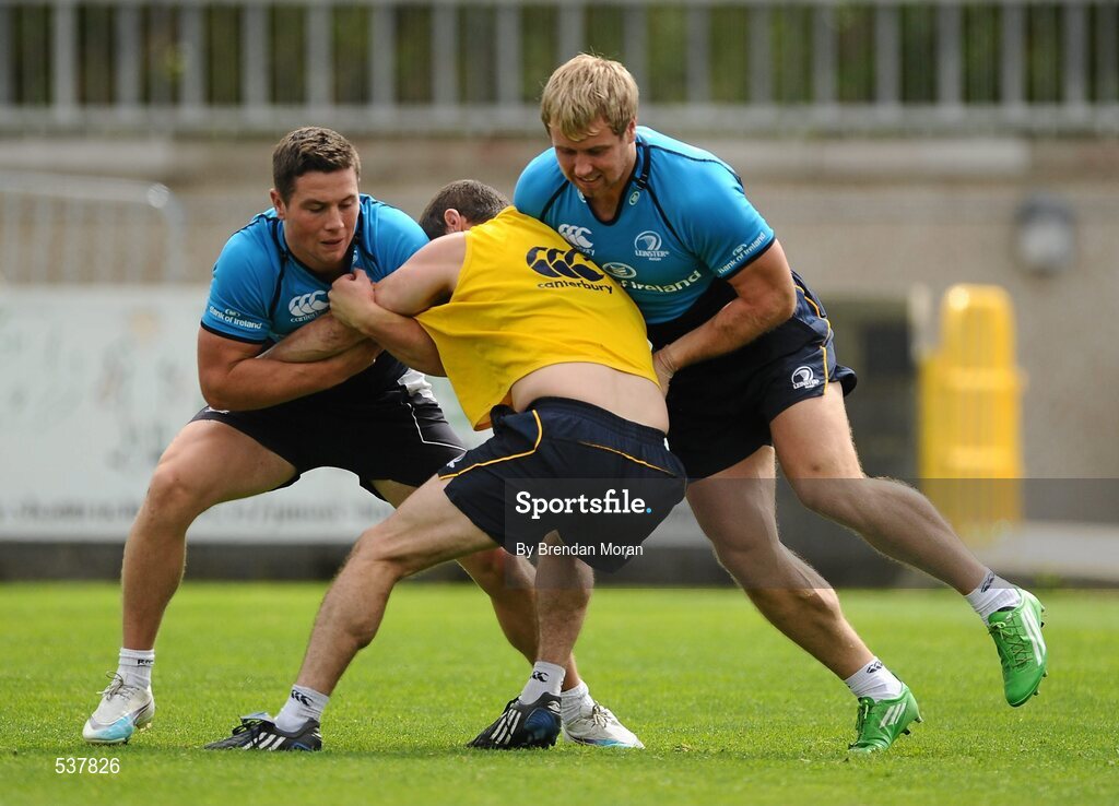 22 July 2011; Leinster's Cillian Willis is tackled by John Cooney, left, and Fionn Carr during an open training session ahead of the 2011/12 season. Tallaght Stadium, Tallaght, Dublin. Picture credit: Brendan Moran / SPORTSFILE