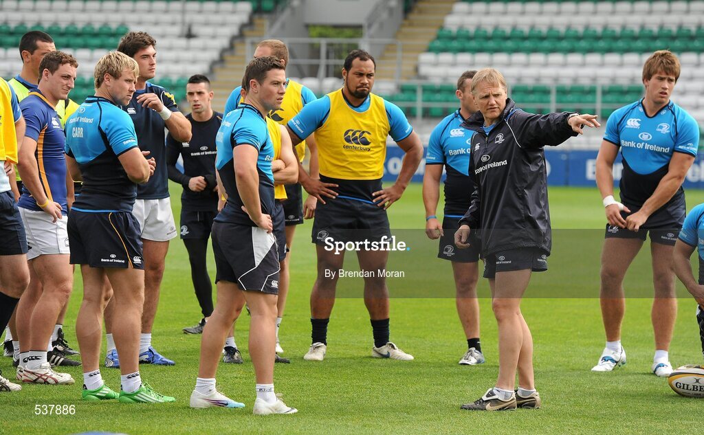 22 July 2011; Leinster head coach Joe Schmidt speaks to his players, including Darren Hurson, Fionn Carr, Eamonn Sheridan, John Cooney, Leo Auva'a and Dominic Ryan during an open training session ahead of the 2011/12 season. Tallaght Stadium, Tallaght, Dublin. Picture credit: Brendan Moran / SPORTSFILE