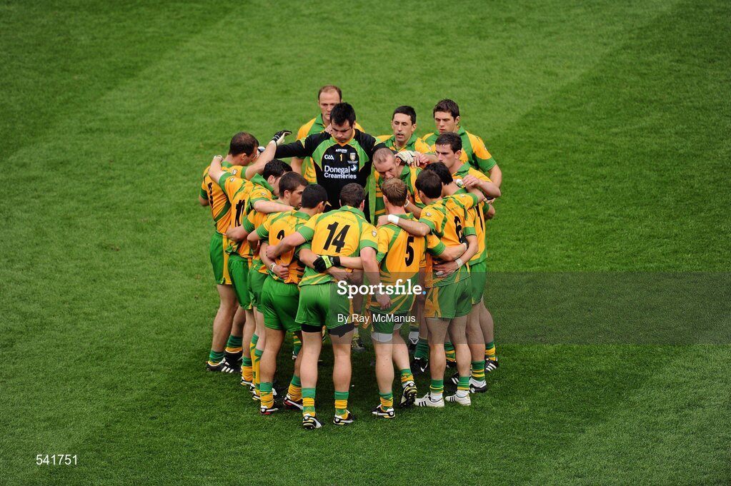 30 July 2011; Donegal captain Michael Murphy addresses his team-mates before the start of the game, moments before he was substituted. GAA Football All-Ireland Senior Championship Quarter-Final, Donegal v Kildare, Croke Park, Dublin. Picture credit: Ray McManus / SPORTSFILE