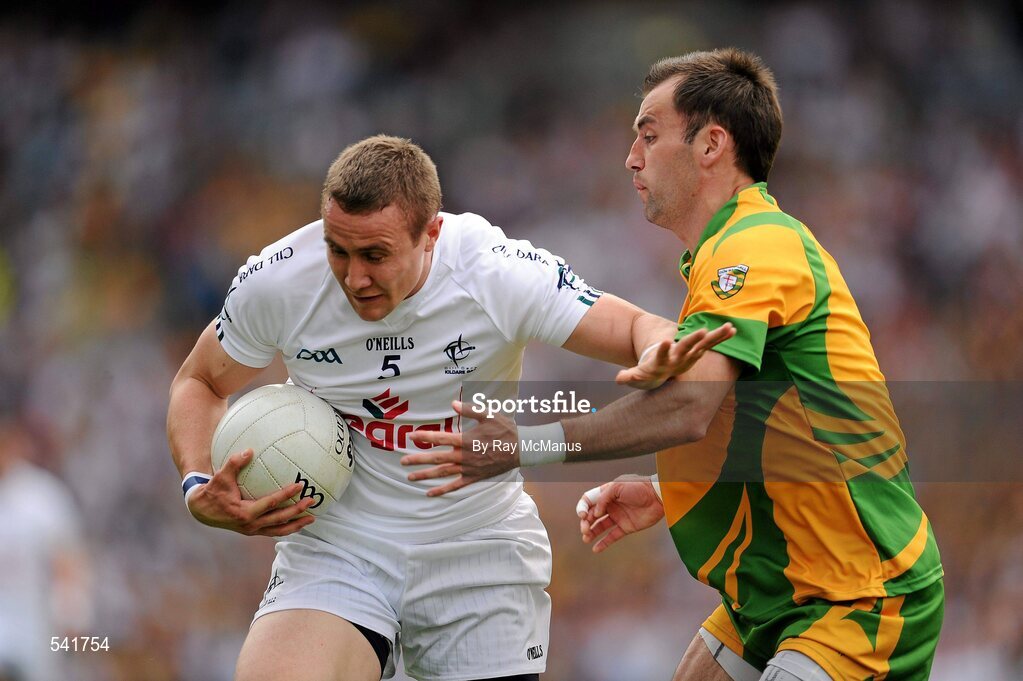 30 July 2011; Brian Flanagan, Kildare, in action against Karl Lacey, Donegal. GAA Football All-Ireland Senior Championship Quarter-Final, Donegal v Kildare, Croke Park, Dublin. Picture credit: Ray McManus / SPORTSFILE