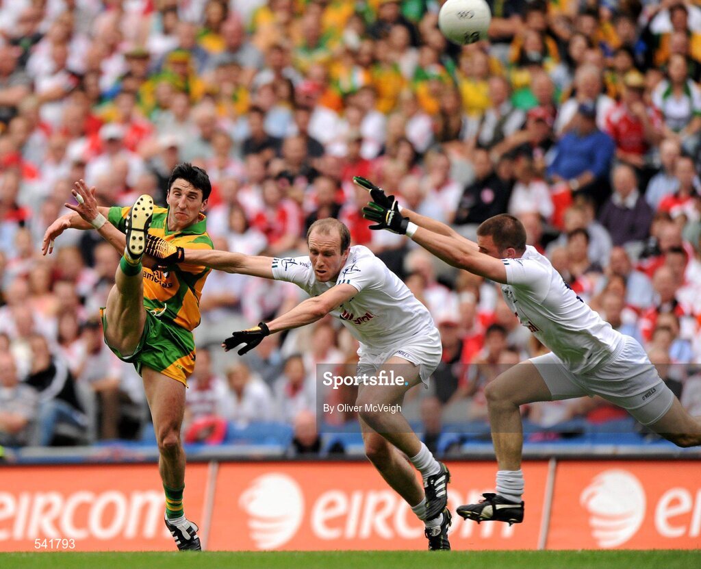 30 July 2011; Michael Hegarty, Donegal, in action against Hugh McGrillen and Daryln Flynn, right, Kildare. GAA Football All-Ireland Senior Championship Quarter-Final, Donegal v Kildare, Croke Park, Dublin. Picture credit: Oliver McVeigh / SPORTSFILE