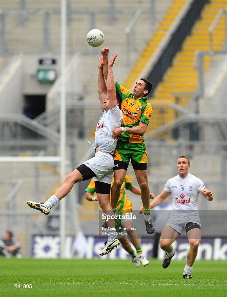 30 July 2011; Rory Kavanagh, Donegal, contests a high ball against Robert Kelly, Kildare. GAA Football All-Ireland Senior Championship Quarter-Final, Donegal v Kildare, Croke Park, Dublin. Picture credit: Dáire Brennan / SPORTSFILE