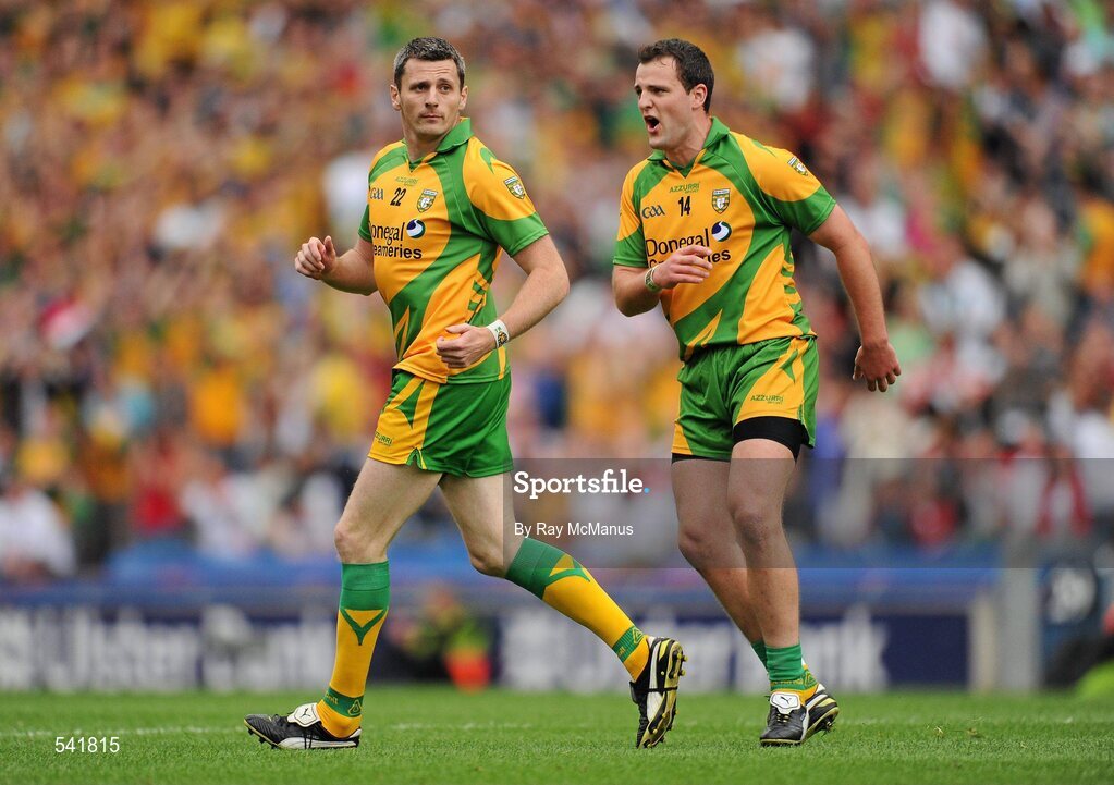 30 July 2011; Christie Toye, Donegal, celebrates after scoring his side's first goal, with team-mate Michael Murphy. GAA Football All-Ireland Senior Championship Quarter-Final, Donegal v Kildare, Croke Park, Dublin. Picture credit: Ray McManus / SPORTSFILE
