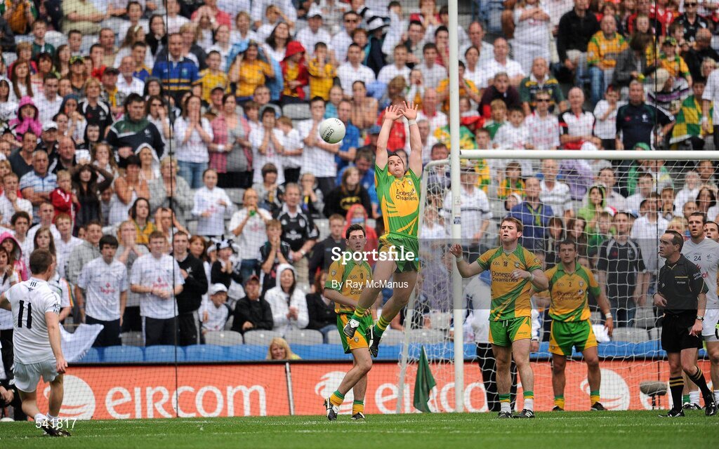 30 July 2011; Kevin Cassidy, Donegal, jumps high but fails to prevent this free by Kildare's Eoghan O'Flaherty, in the last minute, to level the game. GAA Football All-Ireland Senior Championship Quarter-Final, Donegal v Kildare, Croke Park, Dublin. Picture credit: Ray McManus / SPORTSFILE