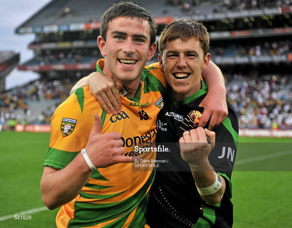 30 July 2011; Patrick McBrearty, Donegal, left, celebrates with Jason Noctor after the game. GAA Football All-Ireland Senior Championship Quarter-Final, Donegal v Kildare, Croke Park, Dublin. Picture credit: Dáire Brennan / SPORTSFILE