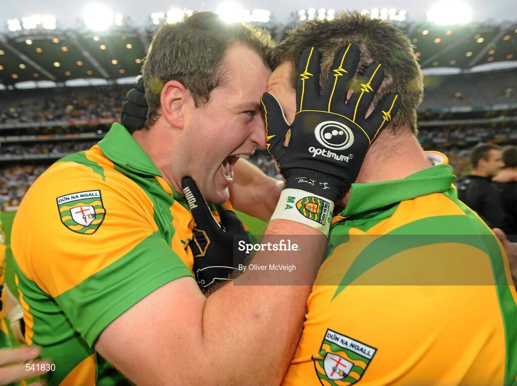 30 July 2011; Michael Murphy, left, and Kevin Cassidy, Donegal, celebrate after the final whistle. GAA Football All-Ireland Senior Championship Quarter-Final, Donegal v Kildare, Croke Park, Dublin. Picture credit: Oliver McVeigh / SPORTSFILE