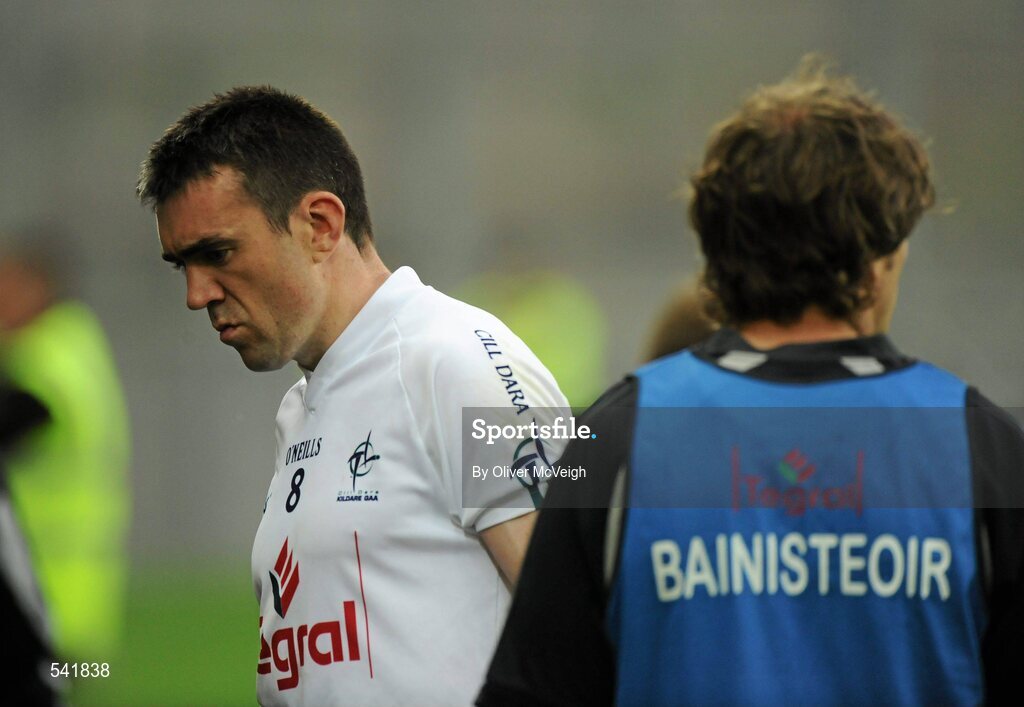 30 July 2011; A disappointed John Doyle, Kildare, walks past manager Kieran McGeeney as he leaves the field after the game. GAA Football All-Ireland Senior Championship Quarter-Final, Donegal v Kildare, Croke Park, Dublin. Picture credit: Oliver McVeigh / SPORTSFILE
