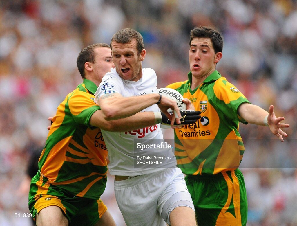 30 July 2011; Ronan Sweeney, Kildare, in action against Neil McGee, left, and Mark McHugh, Donegal. GAA Football All-Ireland Senior Championship Quarter-Final, Donegal v Kildare, Croke Park, Dublin. Picture credit: Dáire Brennan / SPORTSFILE