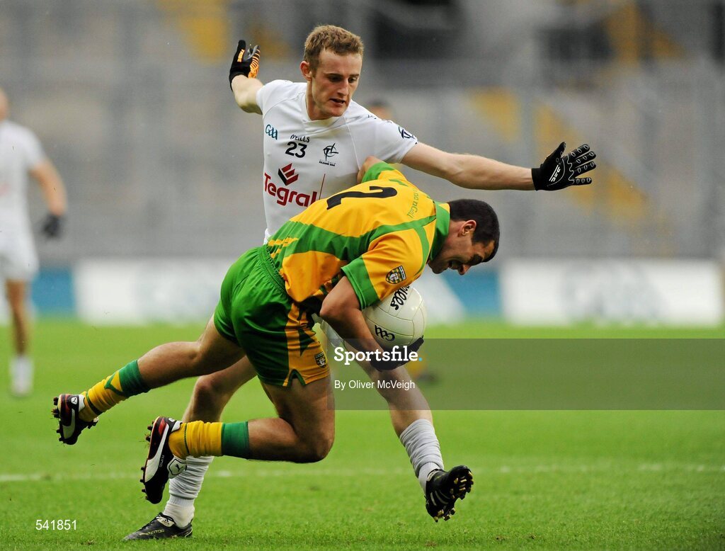 30 July 2011; Frank McGlynn, Donegal, in action against Alan Smith, Kildare. GAA Football All-Ireland Senior Championship Quarter-Final, Donegal v Kildare, Croke Park, Dublin. Picture credit: Oliver McVeigh / SPORTSFILE
