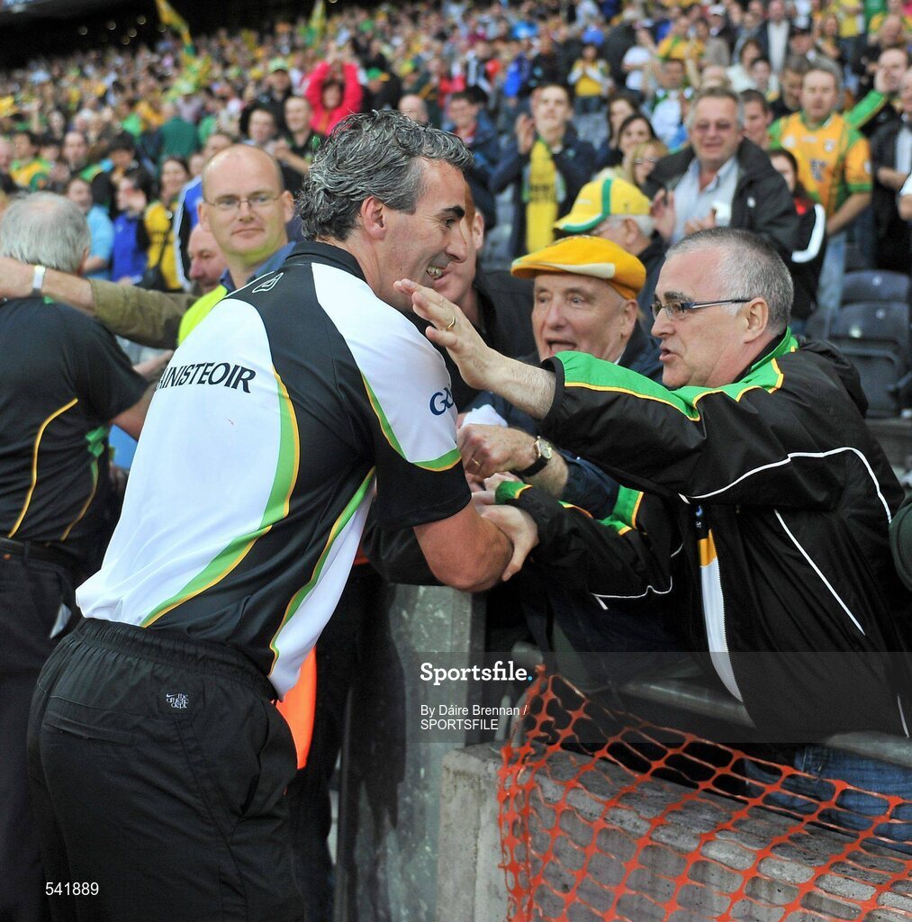 30 July 2011; Donegal manager Jim McGuinness is congratulated by supporters after the game. GAA Football All-Ireland Senior Championship Quarter-Final, Donegal v Kildare, Croke Park, Dublin. Picture credit: Dáire Brennan / SPORTSFILE