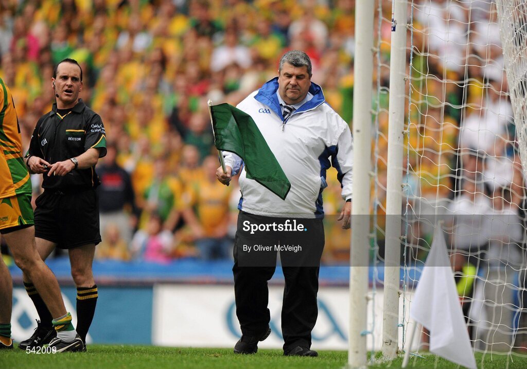 30 July 2011; The umpire picks up his flags to indicate a 'goal' for Kildare had been disallowed. GAA Football All-Ireland Senior Championship Quarter-Final, Donegal v Kildare, Croke Park, Dublin. Picture credit: Oliver McVeigh / SPORTSFILE