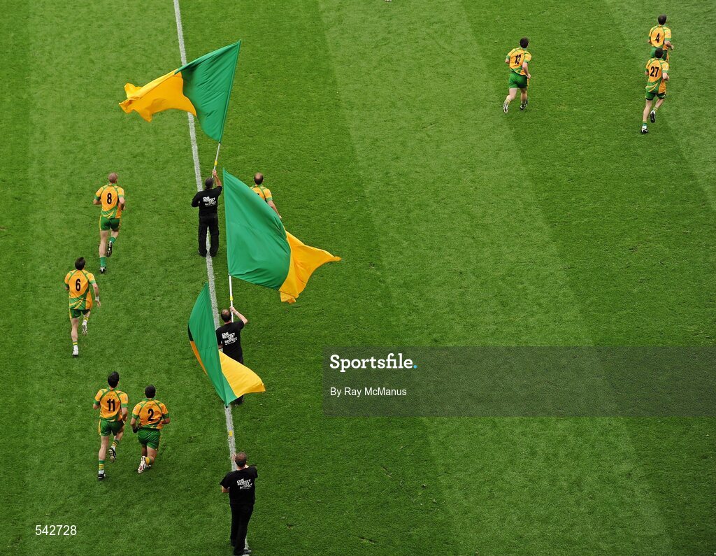 30 July 2011; Members of the Donegal team run out through flagbearers before the game. GAA Football All-Ireland Senior Championship Quarter-Final, Donegal v Kildare, Croke Park, Dublin. Picture credit: Ray McManus / SPORTSFILE