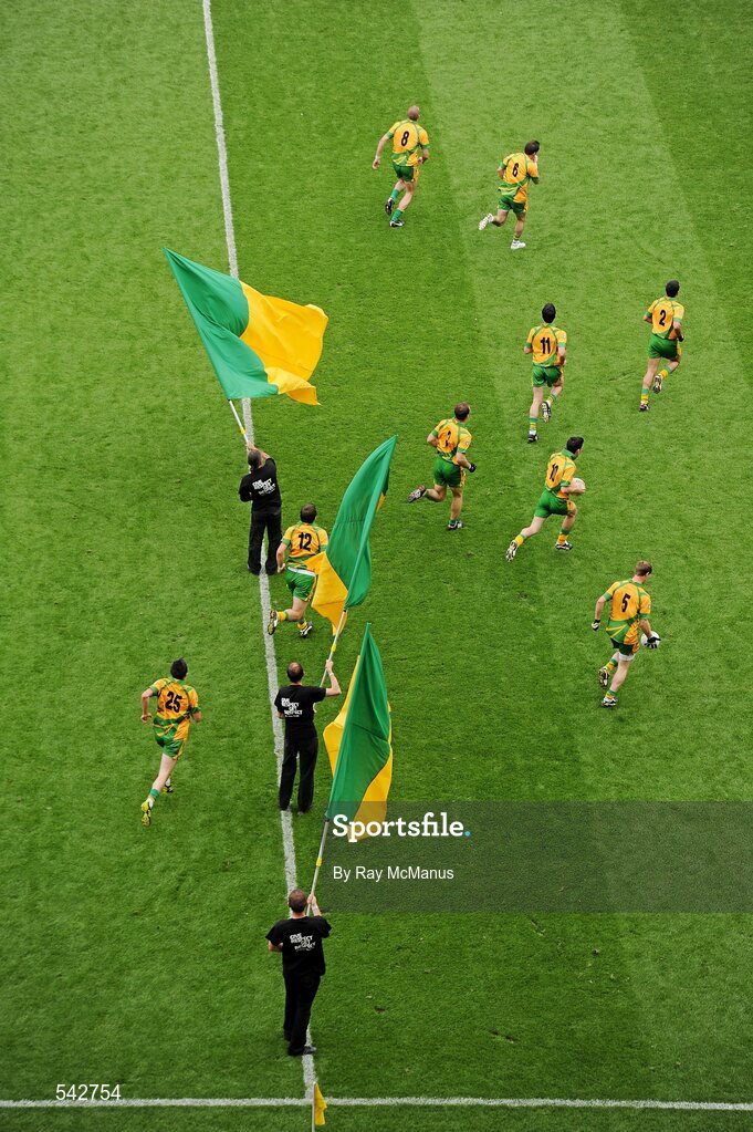 30 July 2011; Members of the Donegal team run out through flagbearers before the game. GAA Football All-Ireland Senior Championship Quarter-Final, Donegal v Kildare, Croke Park, Dublin. Picture credit: Ray McManus / SPORTSFILE