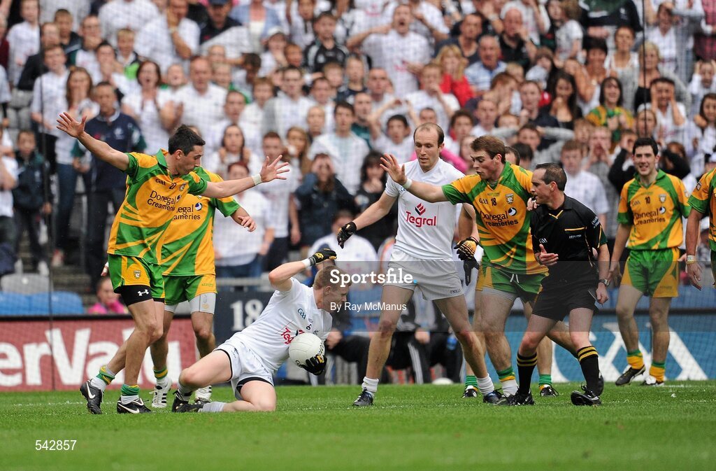 30 July 2011; Referee Davis Goldrick blows the whistle to indicate a free as Morgan O'Flaherty, Kildare, is fouled by Rory Kavanagh, Donegal, in the last minute of normal time. GAA Football All-Ireland Senior Championship Quarter-Final, Donegal v Kildare, Croke Park, Dublin. Picture credit: Ray McManus / SPORTSFILE