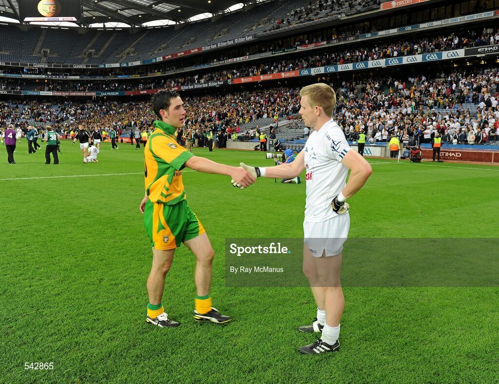 30 July 2011; Mark McHugh, Donegal, shakes hands with Morgan O'Flaherty, Kildare. GAA Football All-Ireland Senior Championship Quarter-Final, Donegal v Kildare, Croke Park, Dublin. Picture credit: Ray McManus / SPORTSFILE